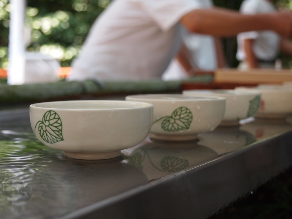 さて、本日から始まった御手洗祭。下鴨神社の本殿東にある御手洗池の水に足を付け、知らず知らずのうちに身についてしまった罪や穢れを洗い流すという神事です。足をつけた後は御神水を頂き、中からも体を清めて、延命長寿の御利益を授かるのです。御手洗池の水はかつては井戸から自然に湧いていたそうですが、現在は地下水をくみ上げ、その温度は年中17℃だともいわれます。今日の昼は36℃でしたので、20℃近い温度差ですね!最初に足に感じる冷たさはかなりのもの!でも、池を進んでいるうちにだんだんと体が慣れて、ちょうどよくなってきます。