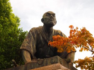 この像は、武士が土下座をしているような姿から、待ち合わせ場所としてもよく使われます。三条大橋を越えれば、そこは飲み屋街の木屋町。私も学生時代には「土下座前」で集合したことを思い出します。インパクトの強いこの像は、もちろん土下座をしているのではありません。
