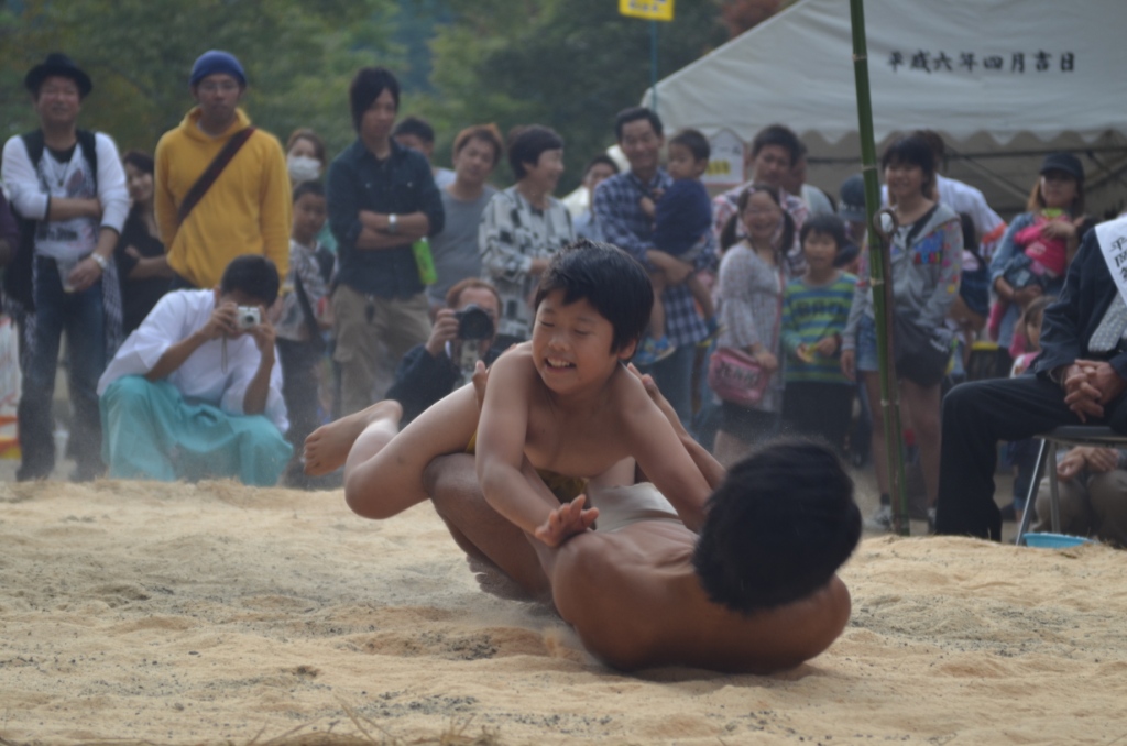 さて、実際の相撲は大人が圧倒的なパワーで子どもを持ちあげては振り回し、子どもは今にも負けてしまいそうなほど追いつめられます(笑)そこに周りの観客からの熱い声援も飛び交って、力を得た子どもが逆襲して大人を押し倒してしまうのです。これがかなり面白いので、是非動画でご覧ください。体格差のある子どもと大人が立ち合いで睨み合う姿も見ものでした。