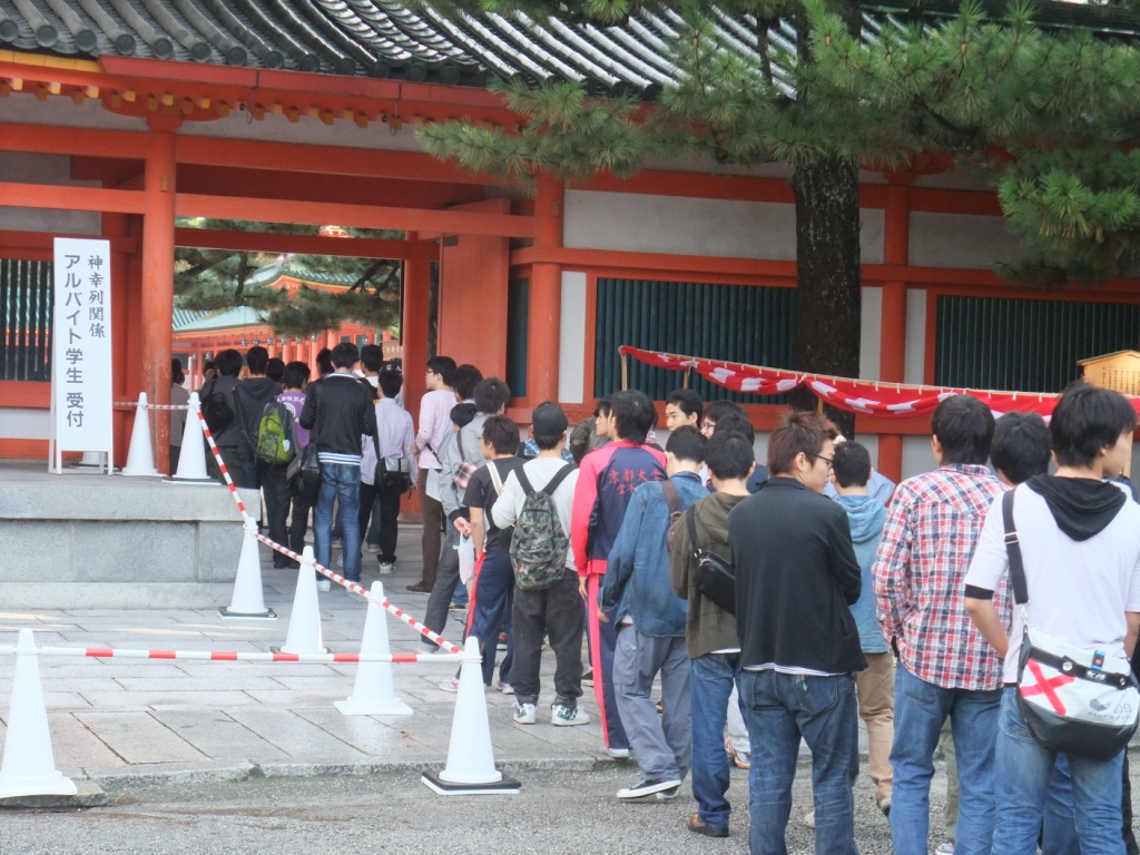 加えて学生もアルバイトとして参加しており、私も学生時代には織田公上洛列の一員で参加させていただきました。学生は早朝に平安神宮に集合して受付を済ませると、受付順で何を持って歩くかが決まります。この当たり外れが激しく、小柄な私は、なんと「はさみ(鋏)箱」でした。当然中身は空ですが、それでも重心が高いので非常に重く、後半は疲れ果てていたことを思い出します(笑)