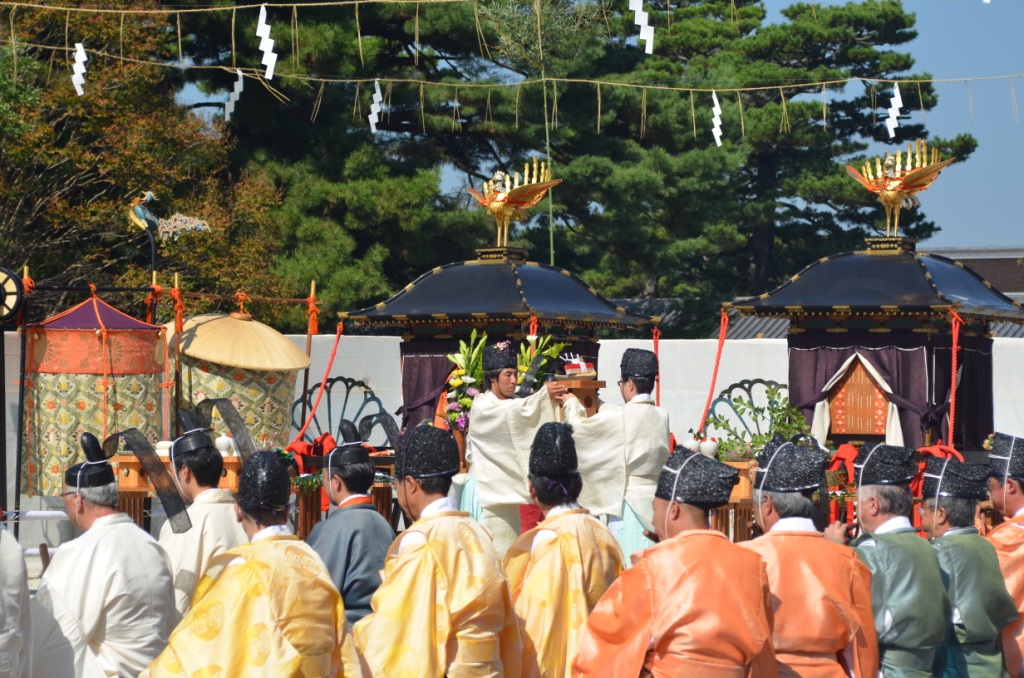 さて、京都御苑の建礼門前にもうけられた行在所(あんざいしょ)に鳳輦が到着すると、神事(行在所祭)が始まります。時代祭が行われる10月22日は桓武天皇が平安京に遷都を行った日で、京都の誕生祭として時代祭が行われます。風俗行列は明治28年の内国勧業博覧会の記念行事として始まり、列の数を増やしながら今日に至っています。