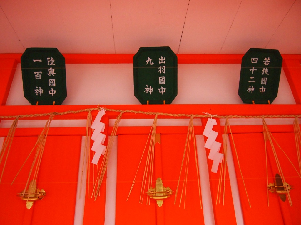 余談ですが、八角形の社の周りには延喜式神名帳に対応して全国各地の神々が祀られ、各国ごとに神々の数が掲示されているのですが、実は越前国と三河国は、延喜式とは神社数が異なっています。また、延喜式で宮中・京中に属する神々は、周囲の社には記載がないため、単純に各国の神々の数を足していっても延喜式と同じ3132柱とはならず、3113柱となります。この差異については、いずれ吉田神社に伺ってみたいと思います。