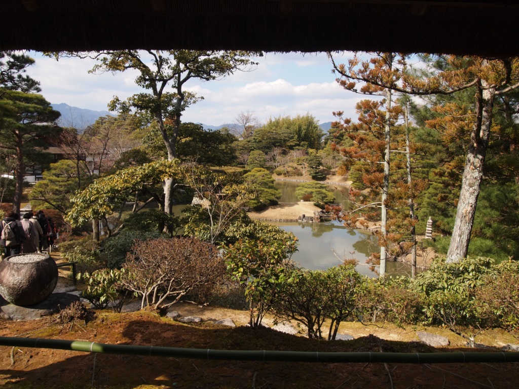 さて、参観コースは笑意軒から来た道を少し戻って、書院へと向かいます。書院は二条城と同じような雁行形をしており、どの部屋からも池庭を楽しむことができるのがポイントです。また、床が2m程も高く上げてあり、これは氾濫を繰り返した桂川の洪水に備える意味もあるそう。実際、この付近の水害頻度は高く、現在も辺りの民家は土台が高くなっていたり、水門があったりとする地域です。