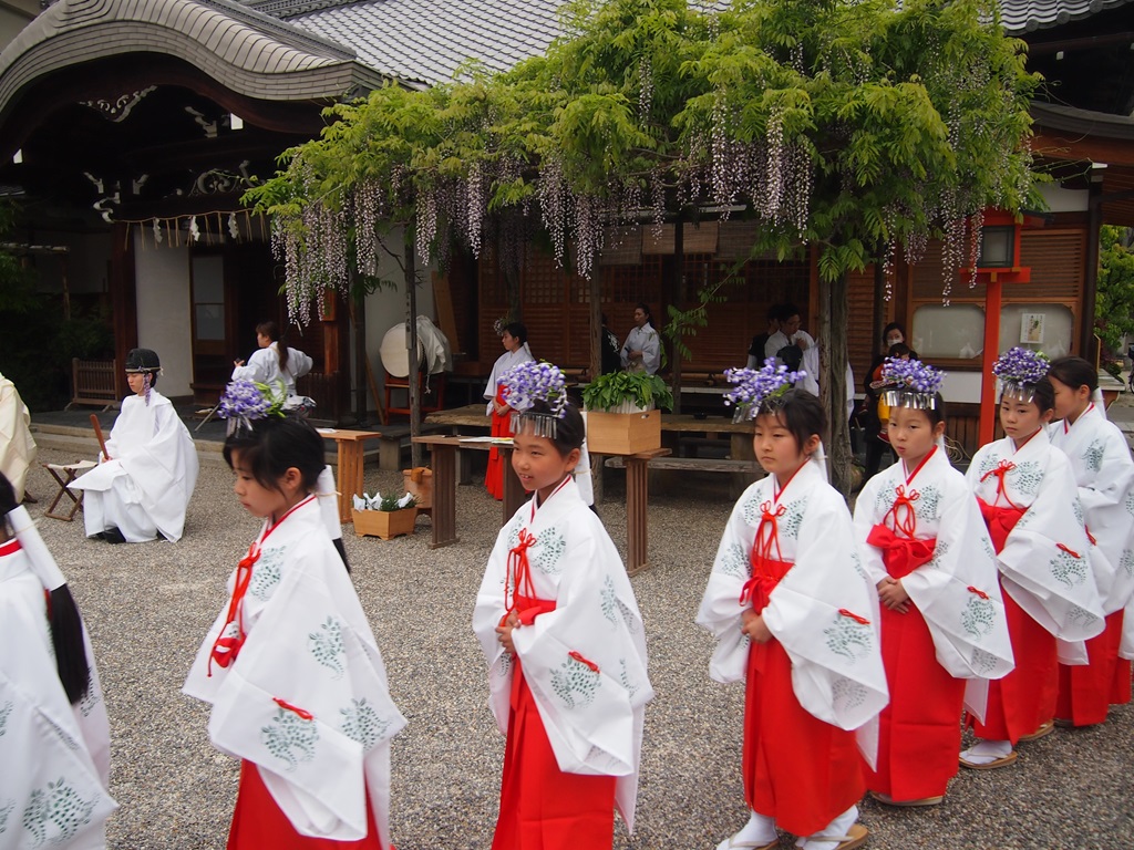 西院春日神社の藤花祭は、平安時代の天長10(833)年に行われた、淳和天皇による「藤のお花見(藤花ノ宴)」にちなむお祭りです。社務所の横には六尺藤が咲き、今年はちょうど見ごろの時期にお祭りが行われました。藤花祭では、神職や参列する童女たちも藤の花の飾り「藤かずら」を頭につけているのが特徴です。童女たちはとても可愛らしく、神事が始まるまでは境内を元気に動き回っていました。