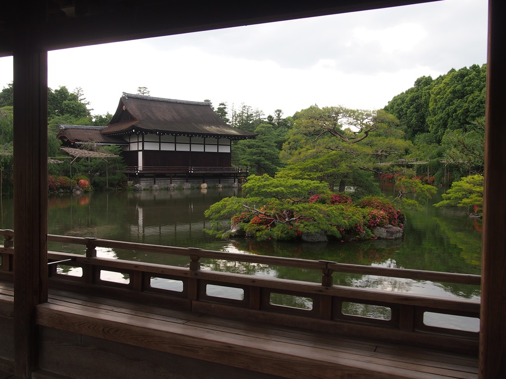 そして池にかかる泰平閣では、多くの方が座って池を眺めています。御所から移された建物にゆったりと座って歓談するのも平安神宮の楽しみ方の一つでしょう。無料開放の日にはもう大変な人混みとなりますが、普段は写真のように額縁のような風景の写真を撮ることもできます。私もしばし一服しながら、池を吹き抜ける風を感じてきました。