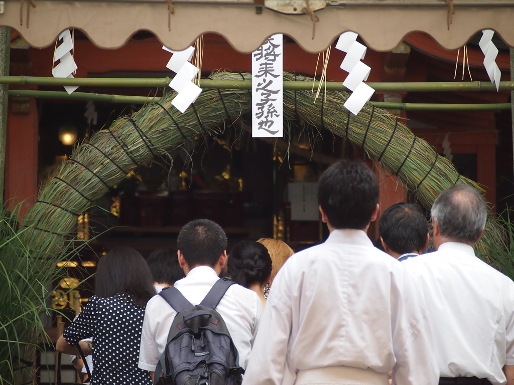疫神社の茅の輪31日の疫神社夏越祭(えきじんじゃなごしさい)が祇園祭の最後の行事。八坂神社の西楼門近くにある疫神社の鳥居に茅の輪がかけられ、これをくぐることで無病息災を願う行事です。10時からの神事には祇園祭の関係者が集まり、その脇では一般の方が茅の輪をくぐるために長い列を作っていました。疫神社や蘇民将来については2011年の夏越祭のブログに詳しいのでそちらをご覧になってみて下さい。