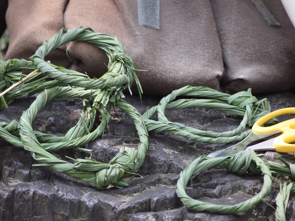 茅の輪をくぐるための行列持ち帰り用の茅は12時頃にはほぼなくなって、中にはくぐるための茅の輪から茅を抜き取る方もおられました。ただ、くぐるための茅の輪は多くの方の穢れを吸い取ったものですので、抜き取らない方がよいでしょう。なお、茅を持ち帰ることにこだわらなければ、12時前に行くと人も少なくなってきてちょうどよいかと思います。