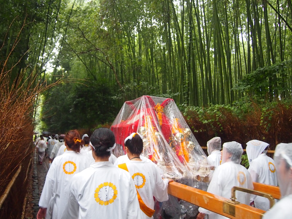 その後、神輿は嵐山のメインストリートを北へと進み、野宮神社を目指します。竹林を神輿が抜けて行きました。野宮神社では神事があり、神輿の担ぎ手たちが境内に集合します。観光客も突然の神輿の来訪に驚きつつも、カメラを向けてシャッターを切るなどしていました。この後、しばらく休憩をはさんで一行は松尾大社へと戻っていきました。往復約4kmの行程、皆さんお疲れさまでした。