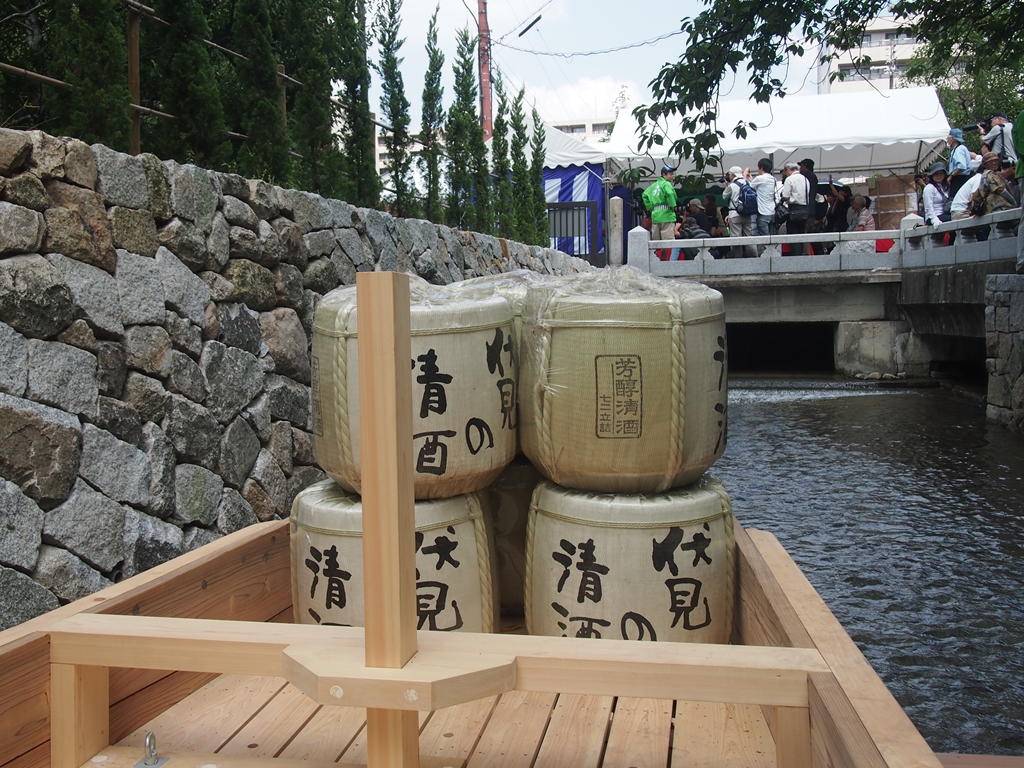 当然ですが、以前の雰囲気からは大きく変わって、真新しい白木の舟。変わらないのは「伏見の清酒」と書かれた樽が乗っているところでしょうか。高瀬川舟まつりでは、高瀬舟に乗ることができるのが恒例です。昨年の段階では2014年までの新造を目指すとのことでしたが、関係者の努力によって舟まつり間にあうことができたのでしょう。私も3年続けて舟まつりを訪れ、こうして新しい船にもいち早く乗ることができ、嬉しい限りです。