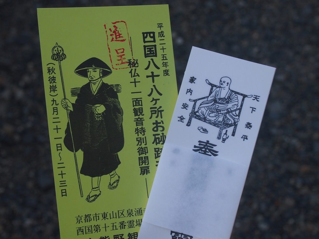 そして、今熊野観音寺では毎年9月21日~23日にはお砂踏み法要が行われて、境内で四国八十八ヶ所の各寺のお砂を踏んで、参拝を行うことができます。今年は「らくたび」さんの散策の添乗で行かせて頂きました。なお、お砂踏み法要は、観光行事というよりは本格的な信仰の行事ですので、ある程度そういった気持ちを持って行かれる方がよいでしょう。