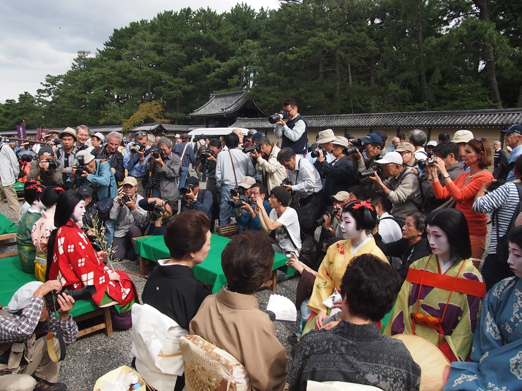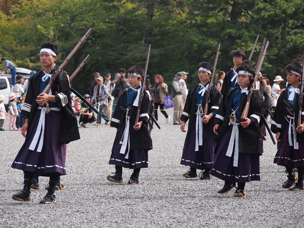 御苑での人気はやはり綺麗どころ。出発直前にやって来る芸舞妓さんが扮する役柄は大人気でした。私はこうした混雑は苦手ですので、パパっと写真を撮って早々に後にしました。近年はカメラマンも増える一方で、特に芸舞妓さんが絡む行事は大変です。御苑は広いので大丈夫だとは思いますが、他の場所では事故が起きやしないか心配です。さて、御苑での様子は写真でお楽しみ下さい。また、動画では維新勤王隊列の鼓笛隊が御苑に入っていく場面もあります。