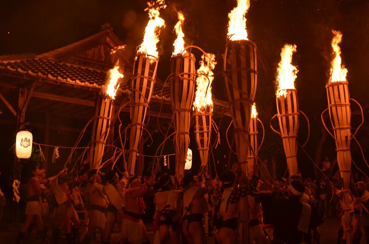 大松明の重さは1本およそ100kg。大人が2-3人で持ち上げます。御旅所の中に入った大松明は立てられるのですが、やはりこれが難しく、時には失敗して火の粉をまき散らしながら倒れる場面もあります。昨年は大松明は9本でしたが、今年は11本が集まりました。まさに火祭りのハイライト!たいへん勇壮な場面です。