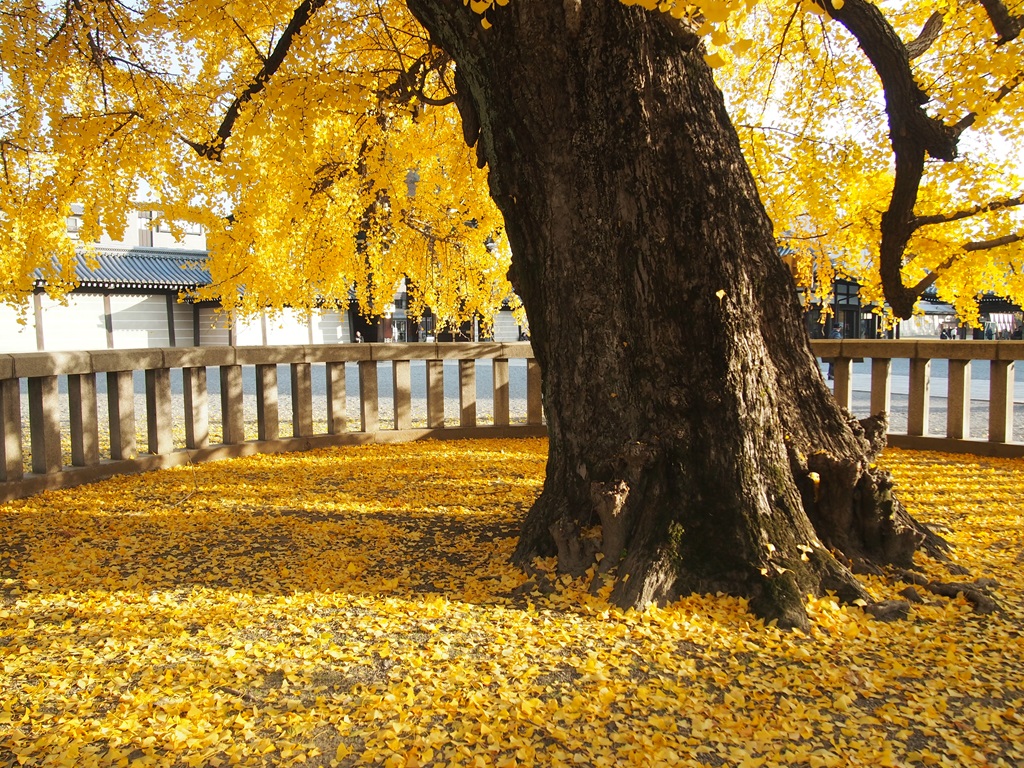 西本願寺 イチョウ京都には、見事なイチョウも多くあります。楓は同じ木でも日当たりのよい外側と、日が当たりにくい内側とで色づきに差が出ますが、イチョウは木全体が均一に黄色になるという特徴があり、さらに見上げるほどの大きな木も多く、その美しさは楓に引けをとらないと個人的には思います。楓の紅葉に対し、イチョウの色づきは黄葉(おうよう)とも呼ばれます。