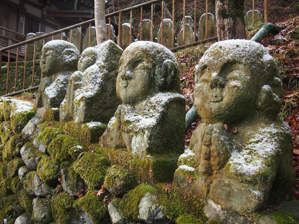 そして愛宕念仏寺にやってきました。境内を拝観すると、千二百羅漢像も「雪化粧」をしていました。これ以上積もると、石像の顔が埋もれてしまうため、これくらいの雪がちょうどよい「化粧」に見えますね(笑)早朝の境内は私だけの貸切で、ゆっくりとお化粧をした石仏を見させて頂きました。この日の天気は回復傾向で、次第境内に日が差してきていました。
