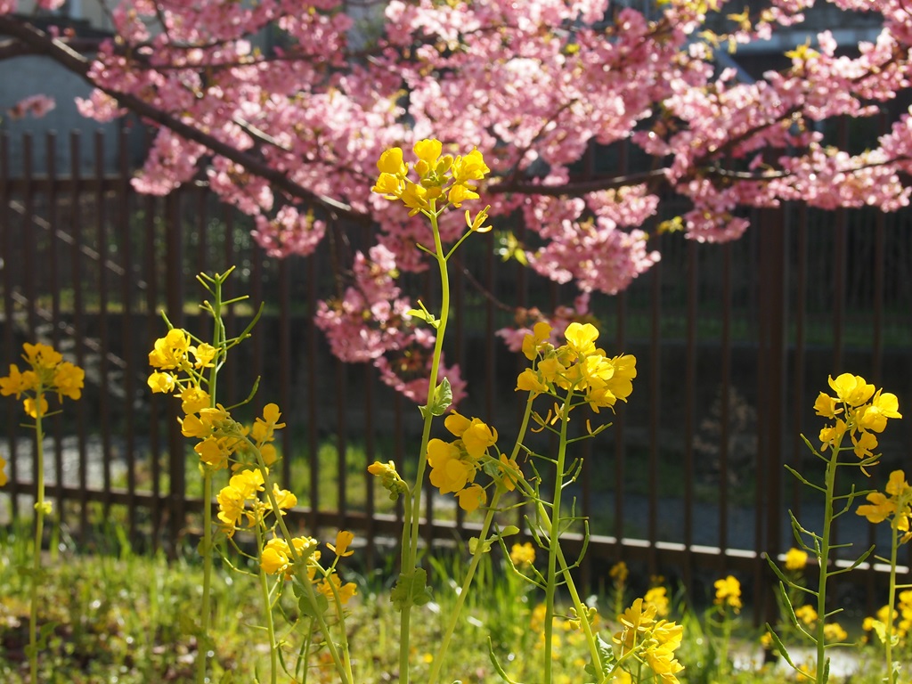 足もとには草の緑が出始めていて、菜の花の黄色も鮮やかでした。淀水路の河津桜は、地元の方の努力もあって次第に有名になりつつあり、私のように写真を撮りに訪れている方もチラホラとお見かけしました。今後も少しづつ木は増えて行くと思いますので、京都の3月の名所として定着していくとよいですね。