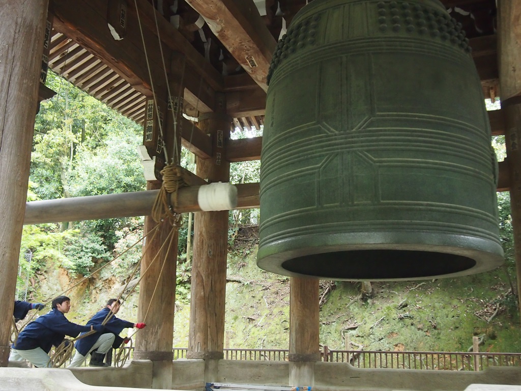 知恩院 御忌の鐘大晦日やその試し撞きでは、僧侶17人で手綱を持つ壮観な光景の中で打たれますが、御忌の鐘はお寺の関係者3名のみで撞かれます。あくまで御忌の行事の一環として、淡々と行われているものなのでしょう。撞木(しゅもく:鐘を打つ木)の重さは約400kgにもなるといわれますが、普通に打つ分には17人もの人数は必要ないようですね。大晦日に鐘を打つ人数も時代によって少し変わっており、古い文献では15名となっているものもあります。