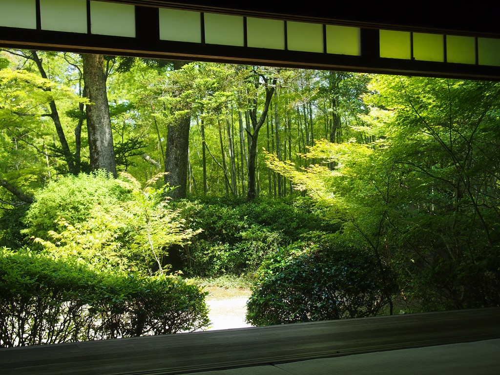 滝口寺には、滝口入道と横笛の木像と、横笛が歌を書いた石などがあり、滝口入道と平家一門の供養塔も立っています。起伏のある境内は緑が美しく、木像のあるお堂には座布団も敷かれ、額縁にはめ込んだような美しい眺めを、心行くまで楽しむことができます。私もこの日は何十分か時を過ごしましたが、他の方に出会うことはありませんでした。祇王寺まで行かれる際は、是非足を延ばしてみて下さい。