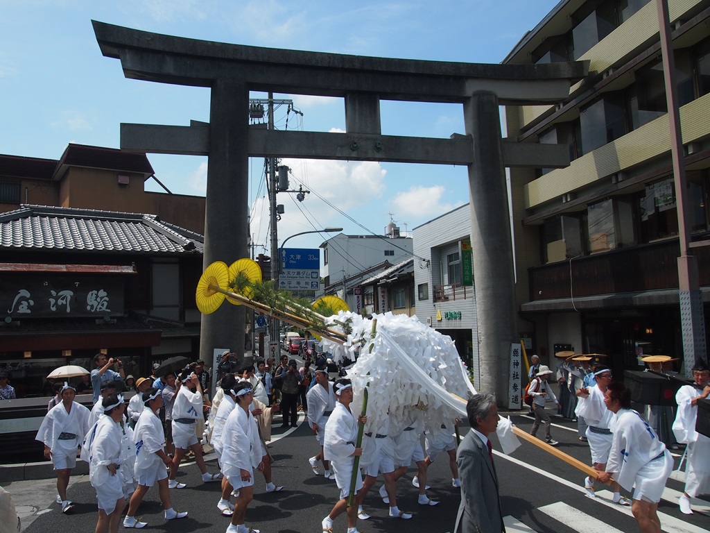県神社 大幣神事先日、県神社の県祭りをご紹介しました。引き続いて8日に行われるのが大幣神事です。その名の通り大人数名で担ぐ全長6mほどの大きな幣が出て、宇治の街を巡行して行きます。幣には3本の傘が差され、ここに八衢彦(やちまたひこ)、八衢姫(やちまたひめ)、久那斗(くなど)の三神が祀られているといいます。さらに大弊には松の枝も付けられており、街々の厄(疫神)が集まり清められるとされています。そしてクライマックスの場面では、大幣を一気に引きずって全力で県神社から宇治橋まで走り抜け、大幣を宇治橋の上から宇治川に投げ捨てます。このかなりユニークな行事は宇治市の無形民俗文化財にも登録されています。