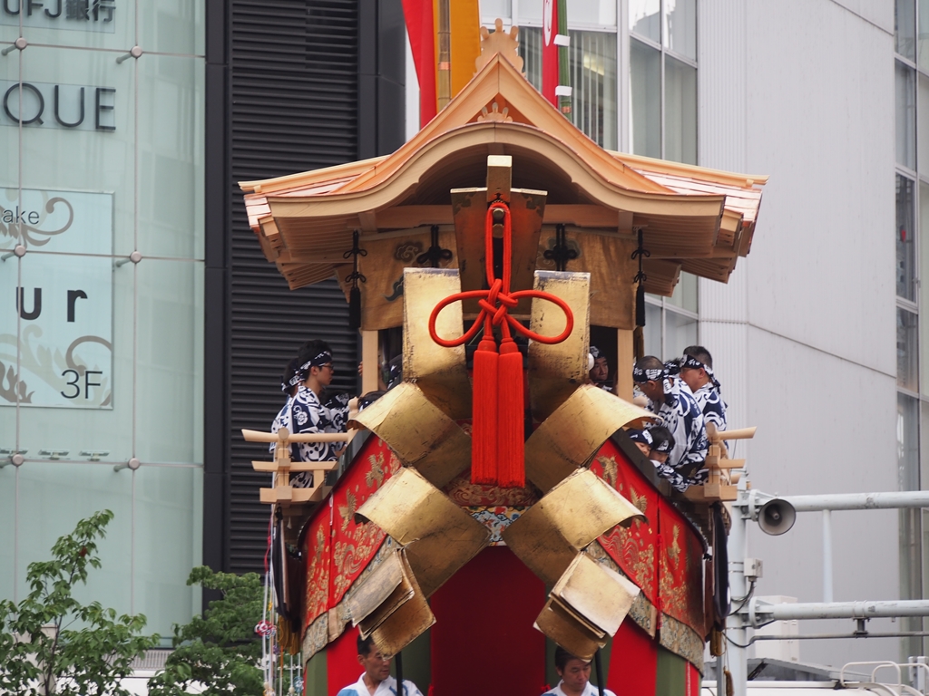 四条河原町で場所を確保してから、大船鉾の出発を見るべく四条町へ。拍手の中で出発をして行く様子は感動的でした。その後、四条河原町に戻り、花傘巡行を眺め、続いて山鉾巡行を眺めてきました。各山が懸想品を見せる場面では拍手が起こり、大船鉾の登場にはもちろん拍手が起こりました。巡行を眺めてから、急いで再び四条町へと向かい、大船鉾が町内に戻り、温かい拍手で迎えられる場面にも立ちあうことができました。京都の悠久の歴史の1ページを見ることができて、本当に嬉しく思います。今回は時間の都合で数枚の写真しかお見せできませんが、近日中に動画とあわせて改めてご紹介させて頂きます。