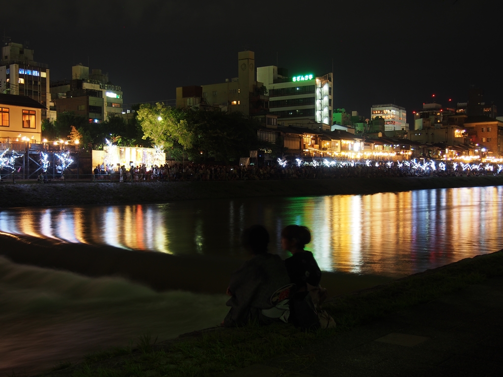 ただ、関係者の努力によって本日午前中には開催が決まり、結果的にはたいへん多くの方が鴨川会場に訪れていました。昨日は濁流にのまれていた場所に美しい明かりが灯り、本当に多くの方が訪れて笑顔を見せている様子には、とても感動させていただきました。本日が最終日となった京の七夕。今年は雨が多く、土日の中止もあって昨年よりも期間中の人出は少なくなっているかもしれませんが、それでも来年につながるような最終日になったのではと思います。今回は、昨日の濁流とはうってかわって、美しく明かりを映す鴨川の写真を掲載します。来年の京の七夕は平穏無事に行われることを願っています。