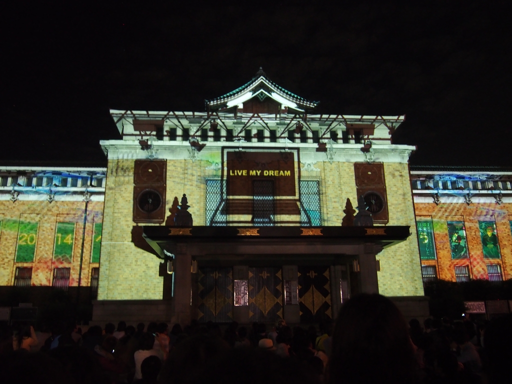 そして最も人を集めていたのが、京都市美術館でのプロジェクションマッピング。建物に芸術的な映像を投影するもので、近年各地で人気を博しています。昨年からプロジェクションマッピングの実践講座を受けたクリエイターの作品がコンペティションとして投影されるようになりました。様々な作品を楽しめるという意味ではよいですが、個人的には玉石混交といった印象でした(芸術は個々の感性ですのであしからず)。