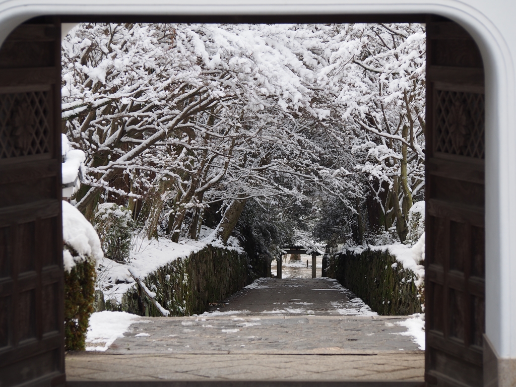興聖寺の雪景色興聖寺は、曹洞宗の宗祖・道元禅師ゆかりの寺で、元は深草に建立されましたがのちに破却され、現在の寺は江戸時代のはじめに淀城藩主となった永井尚政によって、永井家の菩提寺として復興されたものです。血天井でも知られますが、何より名高いのは「琴坂」と呼ばれる一直線に続く参道です。坂の両脇を流れる水が、まるで琴の音色のように澄んだ音を響かせ、たいへん心地よい空間を作り出しています。雪の日は木々がまるで樹氷のように坂を包み込み、幻想的な眺めでした。