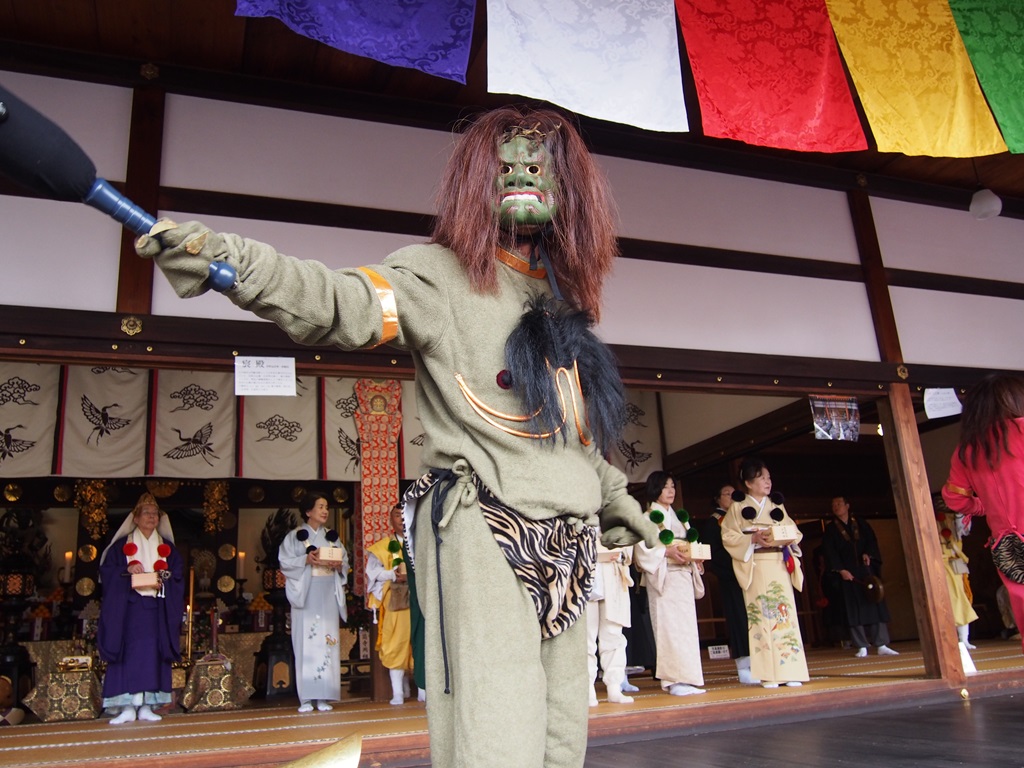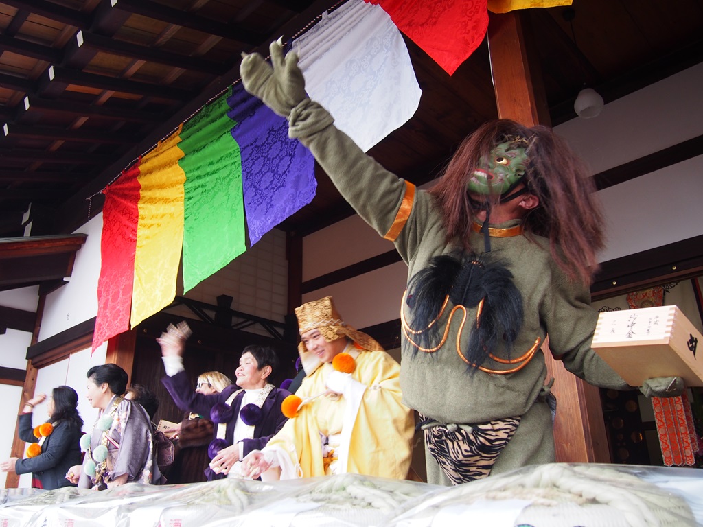 まず法要が厳粛に行われたあと、続いて赤・黄・緑の鬼が入ってきます。鬼には福男・福女から豆がぶつけられますが、あまり効いていないようで、僧侶に襲いかかっていきます。しかしそこは修験道の寺。錫杖を振って法力で鬼たちを調伏して行きます。荒々しい鬼もついにはひれ伏しておとなしくなりました。そして手に持っていたこん棒と交換で、豆の入った枡が鬼に手渡されます。