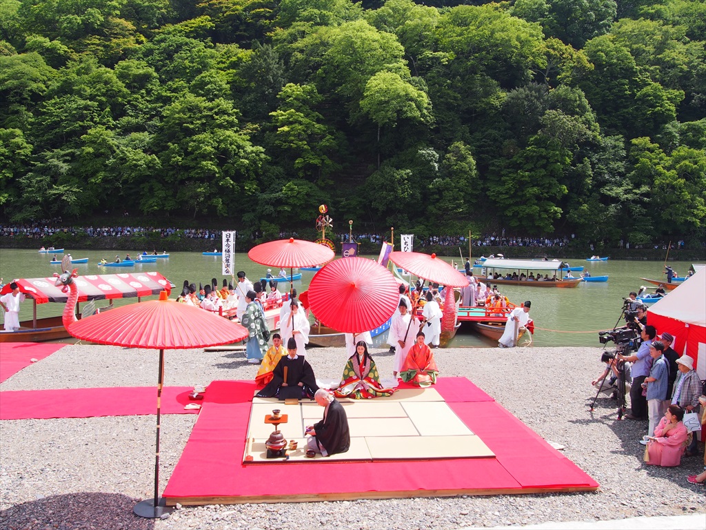 さて、5月17日に嵐山で三船祭が行われました。大堰川に雅な芸能の船が浮かぶ様子が、平安貴族が繰り広げた船遊びを彷彿とさせる優雅な祭りで、車折(くるまざき)神社の祭礼として昭和3年から開催されています。車折神社のご祭神は清原頼業(よりなり)で、昭和天皇の即位を記念して、清原頼業の生きた平安時代の船遊びが再現されました。例年であれば20艘ほどの船が出ますが、昨年は2013年の台風の影響や資金面の問題で中止。今年は地元有志が保存会を作り改めて再開をされました。