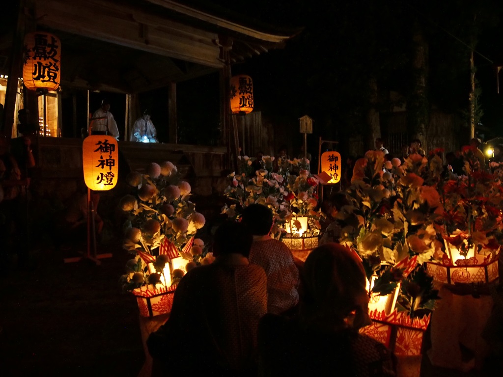 やがて本殿から花笠を下すと鳥居の外に並んでから、再び境内に入りなおして踊りが始められました。今年は例年よりも早い時間に始められたようです。拝殿には神職が花笠の男たちに向かって座し、花笠踊が神職や本殿に向かって奉納されました。暗闇に光る花笠、響く歌声。とても幻想的な光景です。ひとしきり踊ると、神職から挨拶があり、日頃の感謝とねぎらいの言葉が述べられていました。