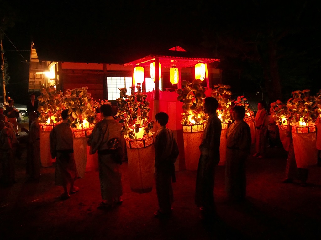 さて、志古淵神社では21時ころから花笠が集まって神事が行われます。上の宮神社と同じように社殿に花笠が並べられると、神職2名が社殿の正面に伏して何かを唱えている姿が印象的でした。神事が終わると、境内に設けられた櫓の周りで盆踊りが始まります。花笠の方々はしばらく休憩に入りました。