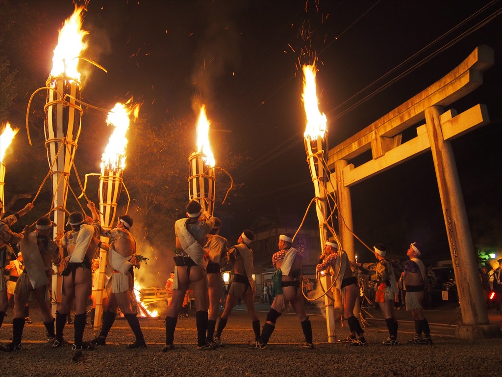 街道を行き交う松明は、子どもたちの「とっくり」と呼ばれる小さなサイズから大人が担ぐ100㎏クラスの大松明(甲斐性松明)まで、だんだんと大きくなっていきます。「さいれいや さいりょう(祭礼や祭礼)」の掛け声も響き渡り、お祭りの雰囲気が高まって行きます。こうした街道を行き交う松明が見られるのも、御旅所のよいところです。