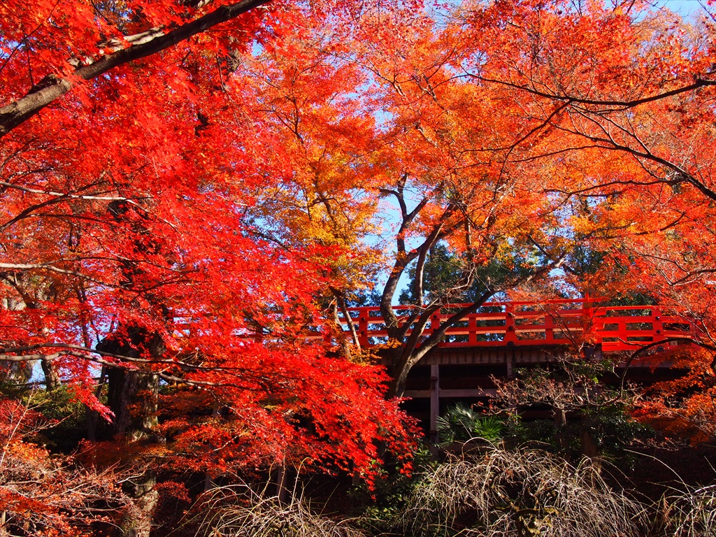 8日に訪れると、まだまだ紅葉はピークで素晴らしい眺めに出会うことができました。今年は最後の最後で、本当にきれいな紅葉が待っていてくれています。ちょうど晴天にも恵まれ、日差しによって輝くもみじは心底美しいと思えます。さらに12月のこの時期とあって人出は少なく、朱色の鶯橋の周りも人が途切れる時間帯がありました。