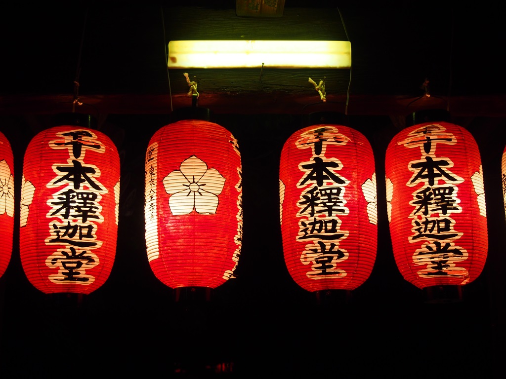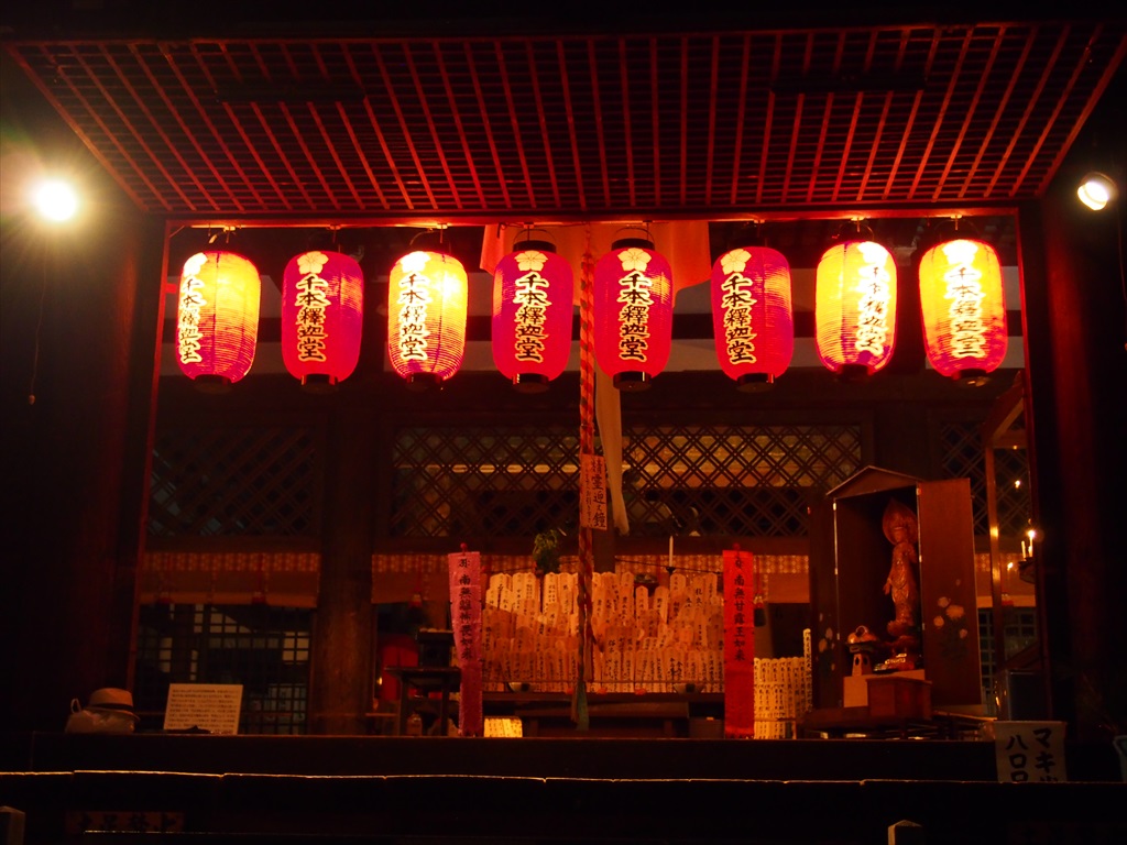 六道まいりの期間中は、塔婆を書いていただけるテントが設けられて本堂が無料解放され、普段は秘仏の行快作の本尊・釈迦如来像もご開帳されます。そして本堂の入り口にある「迎え鐘」を撞くことができます。この迎え鐘は他所と同じく紐(綱)を引いて音を鳴らすものですが、勢いよく引くと「バーン!」と大きな音がしてビックリします。ゆっくり引くとよいでしょう。ゴーンという音ではありませんの悪しからず。六道まいりは昼にも行われていますが、夜には万灯会の様相で灯籠が灯って幻想的。夜8時まで参拝することができます。今年の千本釈迦堂のお精霊迎えは終りましたが、16日にはお精霊送りが同様に行われていますので、訪れてみてください。