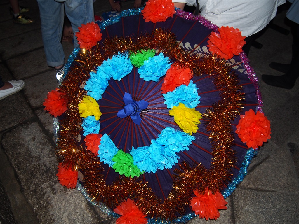 花傘の参宮は室町時代からの歴史を持ち、当時からの風流傘の形体をいまに伝えています。この煌びやかな傘を人が持って激しく上下に揺らしながら歩きます。この持ち方は剣鉾と同様に腰の部分にあてがう形が多く、興味深いものがあります。こうした「傘」は、氏子の各町内ごとに趣向をこらして作りあげるものです。
