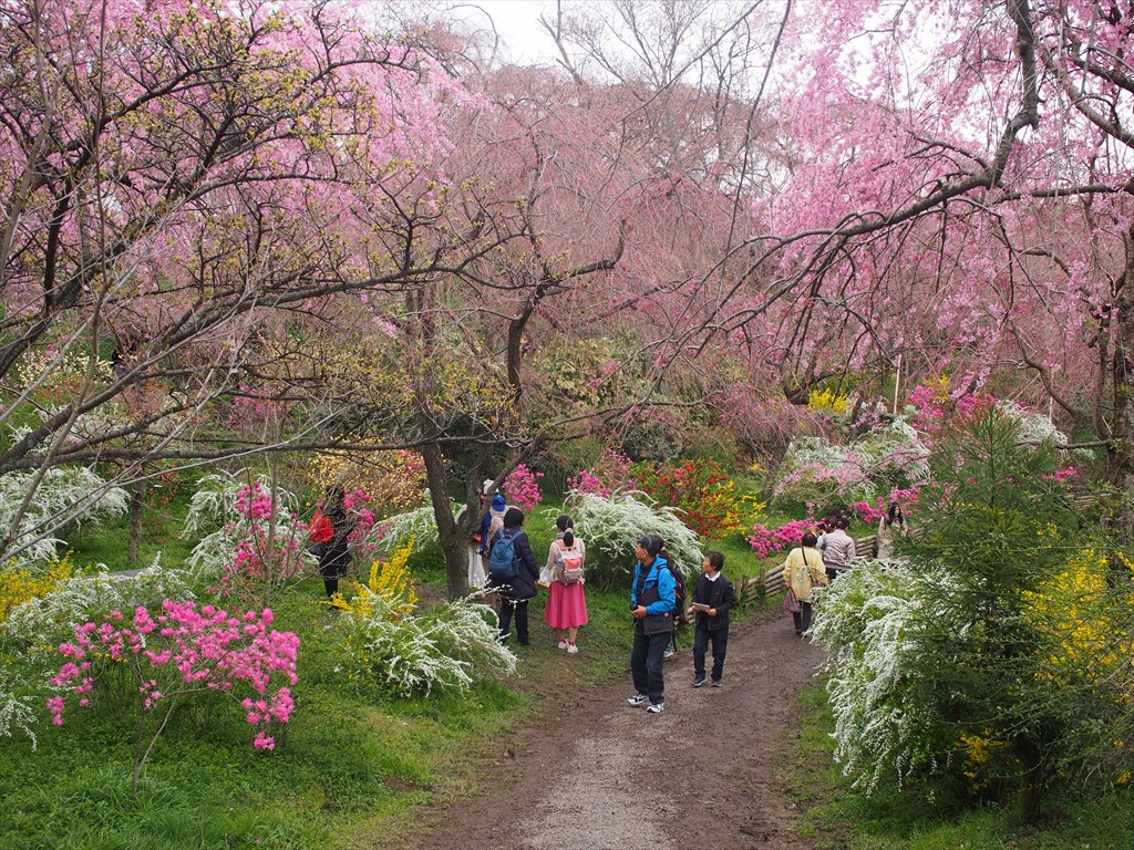 タクシーは道中の混雑状況によりますが、金閣寺付近から1000円程度で行けると思います。無料シャトルバスは西大路通の「わら天神」の前から出発で頻度もあります。近隣の方の迷惑とならないよう整列してお待ちください。さて、原谷苑の素晴らしいところは、シャワーのような紅しだれ桜だけでなく、足元に咲くユキヤナギやツツジ、レンギョウ、ボケなどの花々。満開時ともなれば、上も下も見わたす限りの花花花!!これぞまさに百花繚乱!!行けども行けども花が待っています。それらの様々な色彩が、濃いピンクの紅しだれ桜をいっそう引き立てています。ピークは今週末からとなりそう。ぜひ、足を延ばしてみてください。