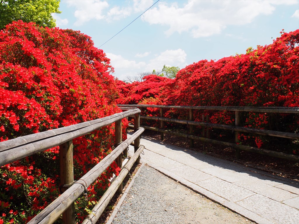 長岡天満宮 キリシマツツジ4月下旬の京都で華やぐのが、京都市の南西にある長岡京市。長岡天満宮のキリシマツツジや乙訓寺(おとくにでら)の牡丹が見ごろを迎え、春の味覚であるタケノコも露店に並んで人目を引きつけます。長岡天満宮のキリシマツツジは境内の東に広がる八条ヶ池の参道に咲き、その真っ赤な花は圧巻のひとこと。28日に「NHK文化センター」さんの散策で訪れました。