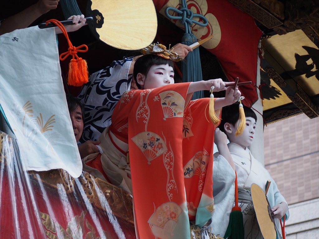 長刀鉾の曳初めは、富小路通まで動き曳く距離が長いのが特徴です。鉾の上ではお稚児さんによる稚児舞も行われており、お稚児さんへの声援も送られます。今年のお稚児さんは出発前は緊張した表情を見せていましたが、稚児舞はしっかりと体をせり出して堂々したものでした。素晴らしかったと思います。