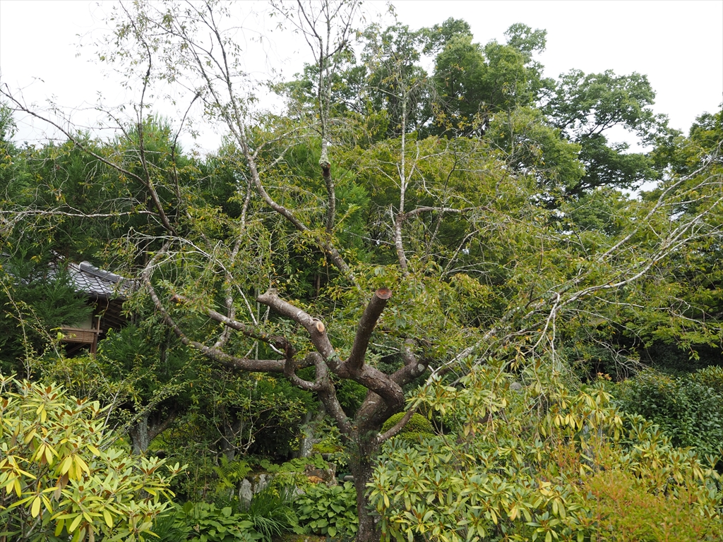 実光院にはもうひとつ庭園があり、歩いて散策ができます。そちらには晩秋から春にかけてチラホラと花を咲かせる珍しい「不断桜」があることでも知られ、紅葉と桜を同時に目にすることもできる珍しい場所です(桜が咲き始めるのはまだ先です)。ただ、不断桜は老齢で弱ってきており、太い枝が伐採されてしまっていました。今後少しでも長く受け継がれていってほしいと思います。