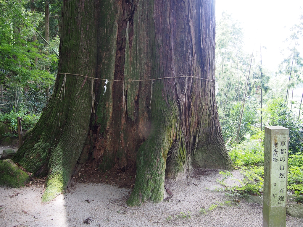 南丹市園部町千妻の朝倉神社は、京都縦貫自動車道の園部ICから東へすぐの場所にあります。道がややわかりにくいものの、距離的にはすぐ近くです。境内には、府の天然記念物で京都の自然200選にも選ばれた巨木な杉がそびえています。高さ約30m、樹齢は400年以上と推定されています。