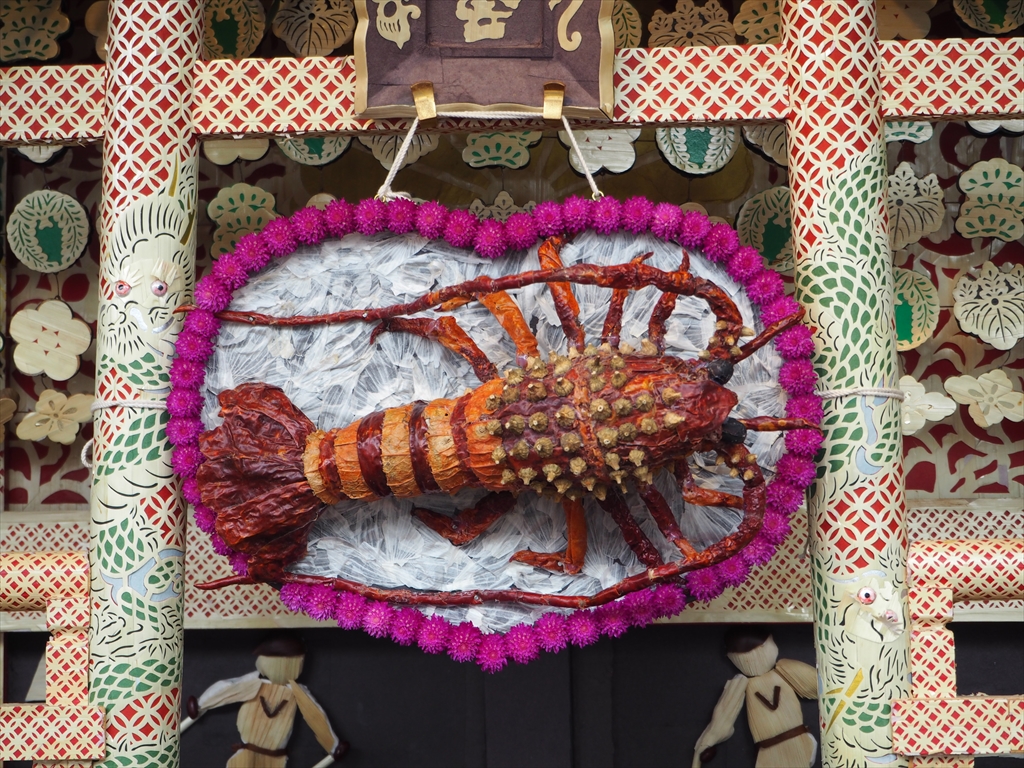 ずいき神輿の装飾には、毎年その時のタイムリーな題材が取り入れられています。今年の題材には、将棋の藤井聡太四段や加藤一二三九段の対局の場面や美女と野獣などがありました。伊勢海老の精巧さには驚かされ、刃傷松の廊下のユニークさも素晴らしかったです。それぞれ多彩な材料を見事なアイデアで使用して形作られており、感嘆するばかり。本当に見事です。