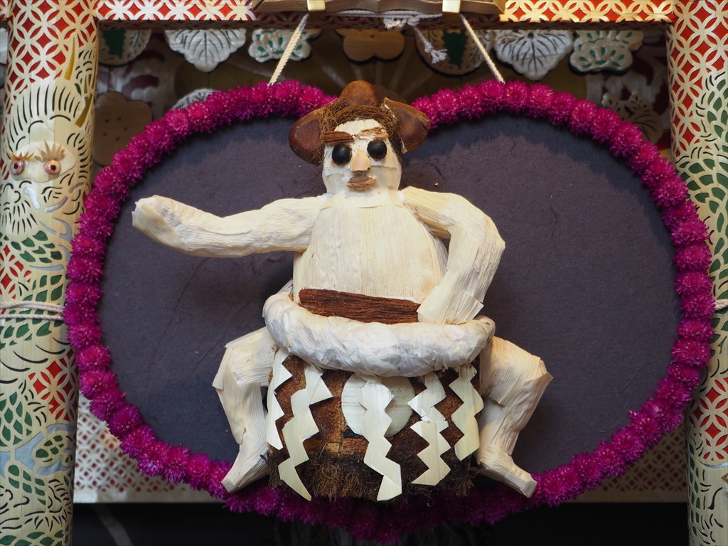 千日紅は9月1日に収穫をして乾燥させたのちに、糸を通す作業を行います。花の総数は1万にも及ぶそう。また数日間持たせるため、ずいきは前日に収穫をして屋根に飾り付けます。数日経つと乾燥して縮み、屋根に隙間ができてくるため4日の還幸祭の前には隙間に補充をするそうです。近年は農家も農地も少なくなりましたが、今も住民たちが自分たちで野菜を育てて神輿を作っていて、毎年気候が違うなか、決まった日付に収穫期を合わせるのは大変なご苦労があるようです。また、麦わら細工は再利用はできますが、その精巧な模様や龍の図柄は友禅の型彫師にお願いをしているそう。まさに住民の思いや伝統技術が一体となって受け継いで来られた伝統です。