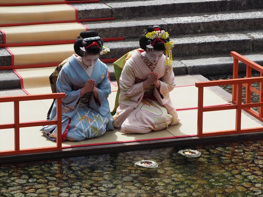下鴨神社の流し雛その後、着物姿の宮川町の舞妓さんもお二人で雛を流していきます。たわわちゃんは下鴨神社の行事にはよく登場しますが、舞妓さんにあこがれる女の子ですので、この行事は嬉しいことでしょう。また、カメラマンが多い理由のひとつもこの舞妓さんにあるのだと思います。この行事には近くの園児たちも来ていて、可愛らしく雛を流していきました。たわわちゃんも、問題なく階段を下りて雛を流しました。