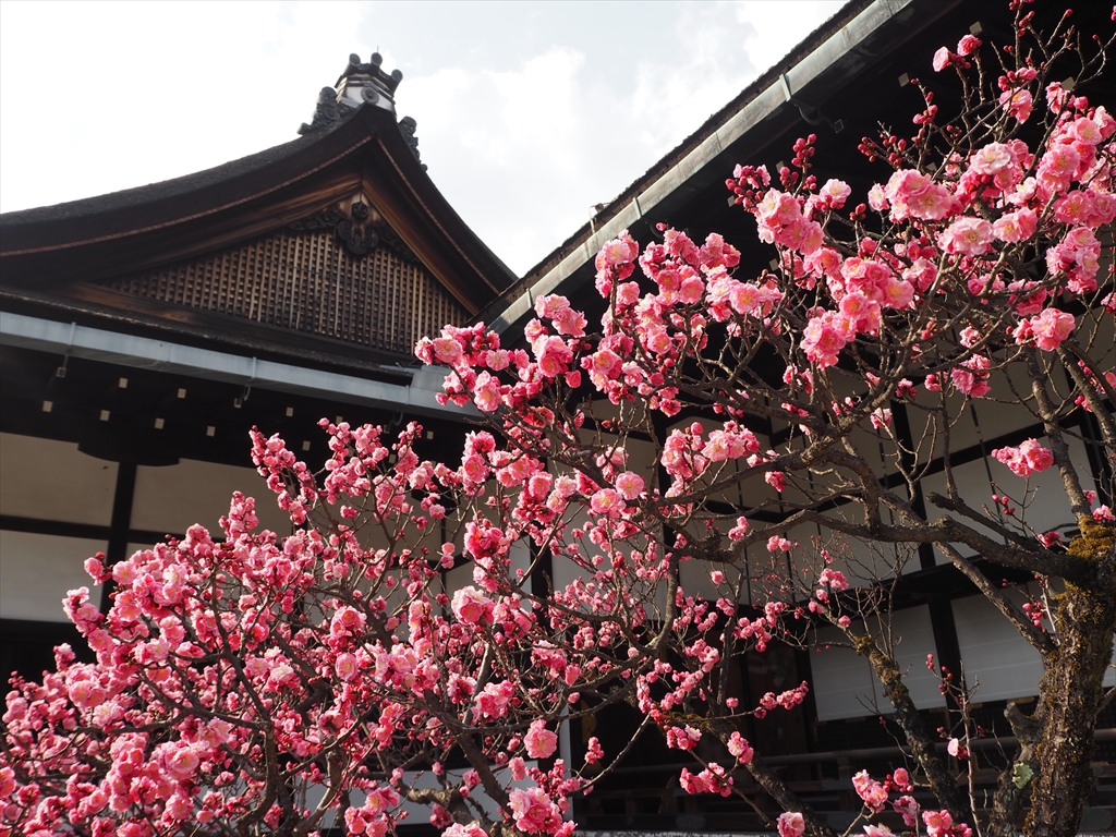 2016年から通年公開が始まった京都御所。海外の方も多く訪れる、京都の新しい観光スポットとして人気です。早春になると御常御殿(おつねごてん)の南側にある紅白の梅が咲き始めます。紅梅と白梅とでは咲くタイミングがずれますが、今年は冬の寒さもあって春がまとめてやってきており、紅白の梅が同時に見ごろになっています。