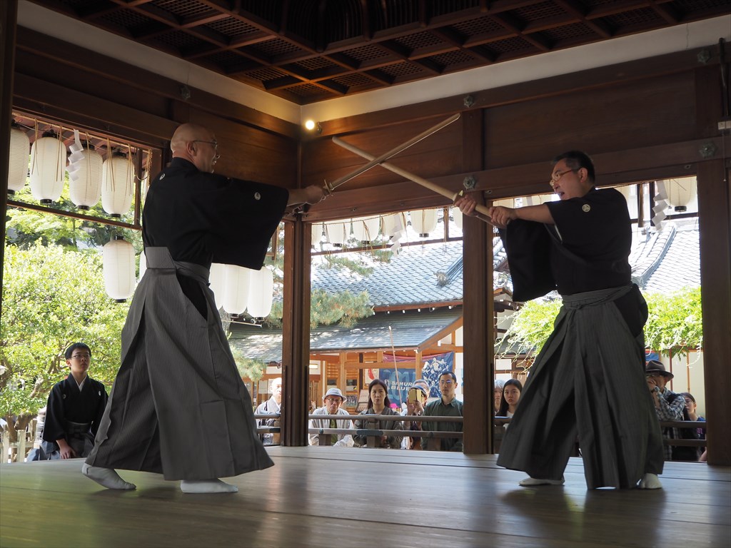 白峯神宮 古武道奉納奉納される古武道の流派は、宮本武蔵の二天一流、桂小五郎や新選組で知られる神道無念流、近藤勇や沖田総司、土方歳三も学んだ天然理心流など、歴史上の人物が習得したものも多く、目の前の演武にその人物を重ねていただくこともできるでしょう。いずれにしても、全国から達人たちが集まり、気合十分のその演武を目にできる貴重な機会です。下鴨神社の4日の奉納とあわせて、機会がありましたら、ご覧になってみてください。