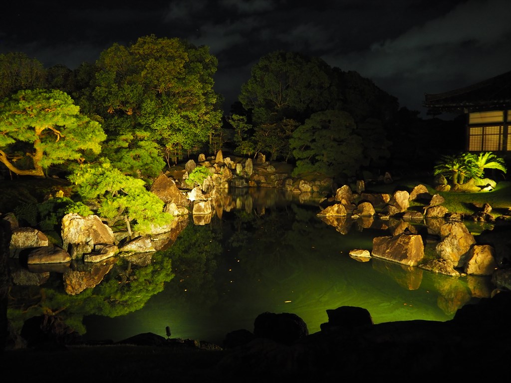 昨年の公開では行けなかった二の丸庭園にも、今回は入ることができました。ただ、大広間の奥へは行けません。それでも庭園を間近で目にすることができ、さらに二の丸御殿の中に明かりが灯っているため、外からは欄間の彫刻が浮かんで、これも昼間とは違った印象の眺めでした。この公開はたいへんおすすめ。期間限定なのがもったいないほどで、ぜひ、多くの方にご覧いただきたいです。10月8日までの夜21時まで受付です。