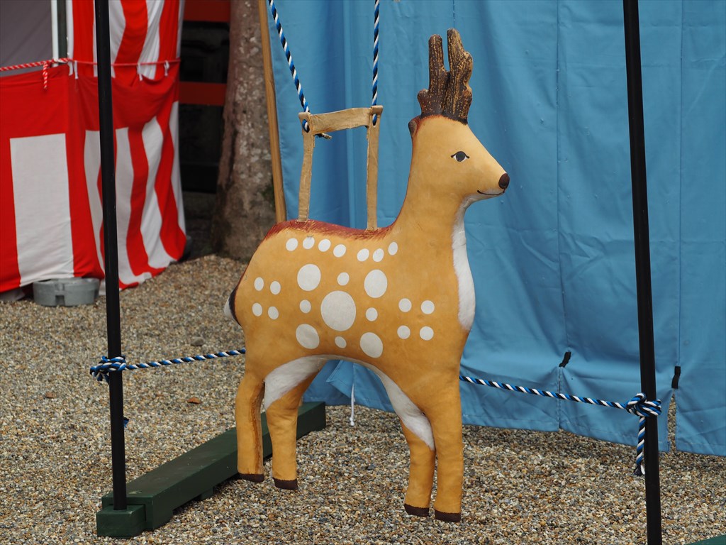 八坂神社 草鹿式八坂神社で草鹿式を奉納されるのは弓馬術礼法小笠原流の皆様。約20m離れた場所の鹿の的を射るのですが、単に当てるだけではダメ。的中と判定されるには24カ所ある鹿の模様のような「星」の場所でなければなりません。さらには射る前から射終わった後にまで細かな作法に則る必要があり、手順を間違えると的中が取り消されるという厳しさです。しかし、やはり日ごろから稽古をされている皆様。思っていた以上にきちんと当てており素人の私はその技術の高さに驚かされました。射ている様子などは動画もありますので、最後にご覧ください。
