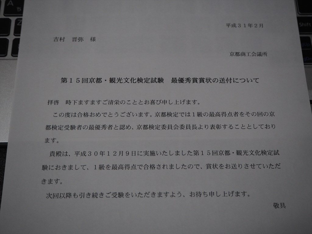 先日、合格をご報告した京都検定1級。今回は合格率が13.4%、合格者は106名と、前回の2.2%、18名と比べると大幅に合格者が増えました。私の得点は144点でしたが、今回も昨年に続いて私が最高得点者ということで、表彰状が送られてきました(同点の方は他にもおられるかもしれません)。京都検定は3級から1級までありますが、最も難度が高い1級の最高得点者を、その回の京都検定全体の最優秀賞として表彰していただけます。今回は合格者が多く、個人的には漢字間違いが2問(マイナス4点)あり、最高得点は難しいと思っていましたので、2年連続でいただけたのは運もありました。