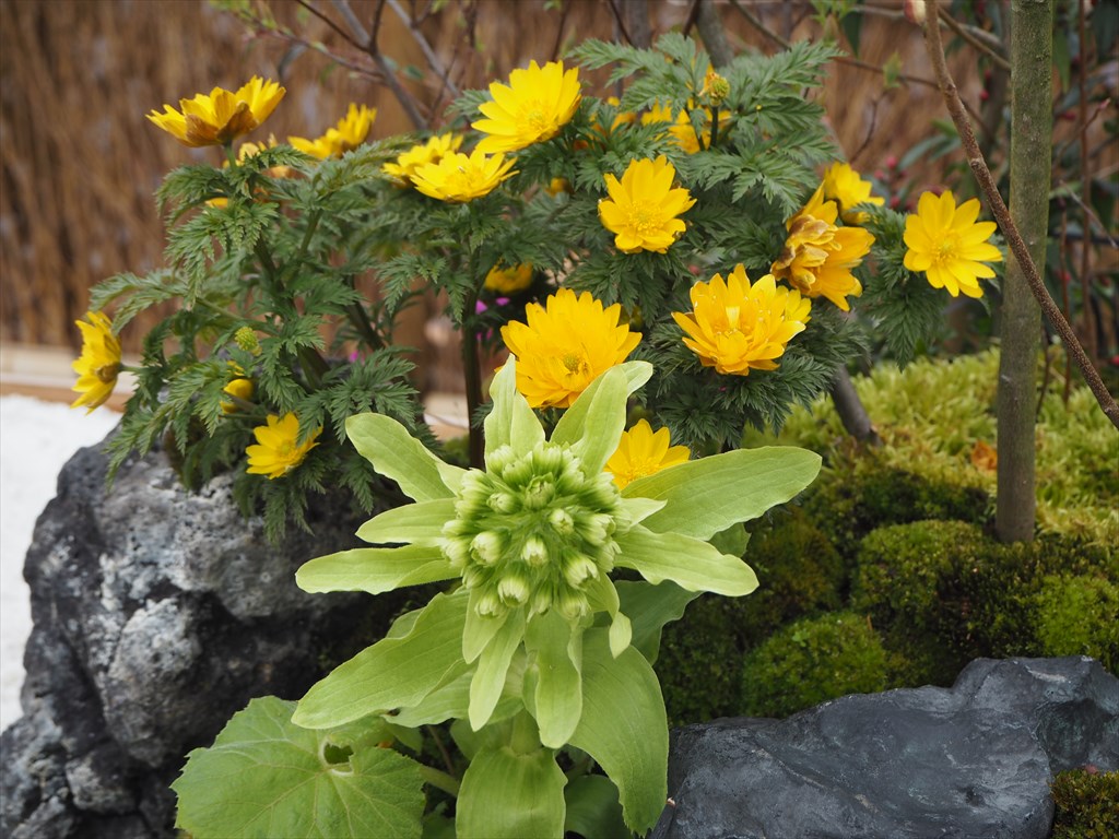 今年は温室内が7つのエリアに分かれて趣向が凝らされていて、花ではありませんが苔庭ゾーンは印象的。3月31日までは「京都検定」の合格証を提示すれば入園料は無料です。植物園内はこうした温室を一歩出ればまだまだ冬の装いですが、北寄りにある梅林では梅が咲いていました。また福寿草やふきのとうが出ている場所もあります。一足早く様々な花と出会える「早春の草花展」とあわせて訪れてみてください。