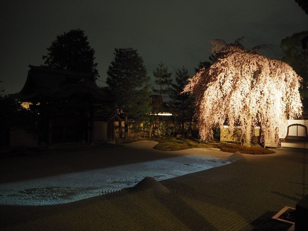 方丈庭園(波心庭)に咲くしだれ桜は、高台寺の春を代表する美しい佇まいで、例年ポスターにも掲載されます。高台寺の桜は江戸時代の都名所図会でも「大木の桜数株ありて、妖艶たる花の盛は園中に遊宴を催し、春を惜むのともがら多し。」と評判を集めた様子が紹介されています。方丈庭園の桜は今の桜で4代目。現在は江戸時代以上に多くの方の目を楽しませているのではないでしょうか。早咲きの桜のためすでに満開を迎えていて、今が最高です。遅くなると葉桜になってしまいますので、できるだけお早めにご覧になってみてください。