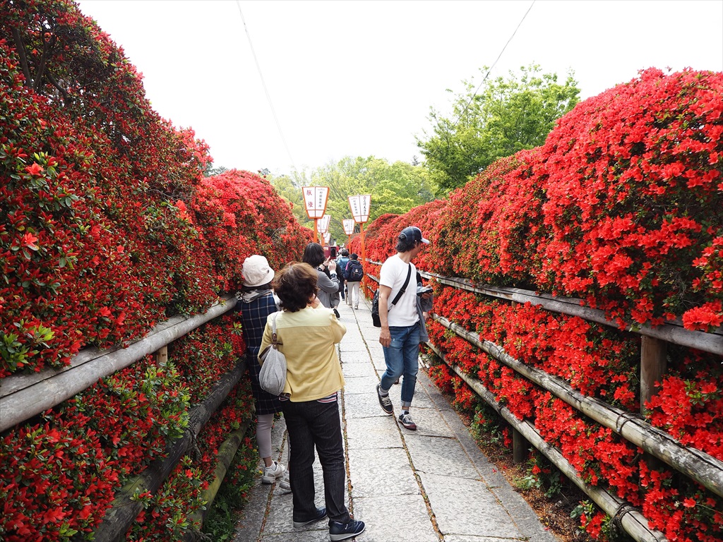 例年、開花が早いのが南側で、23日には見ごろになってきました。北側はまだつぼみが多いですが週末にかけて咲き進んでくるでしょう。通路の真ん中の散策路は普段は通ることができませんが、このキリシマツツジの期間のみ歩くことができます。背丈を超える木々の間を抜けられるのは長岡天満宮だけの魅力でしょう。週末にかけて見頃が続きそうですので、機会がありましたら訪れてみてください。